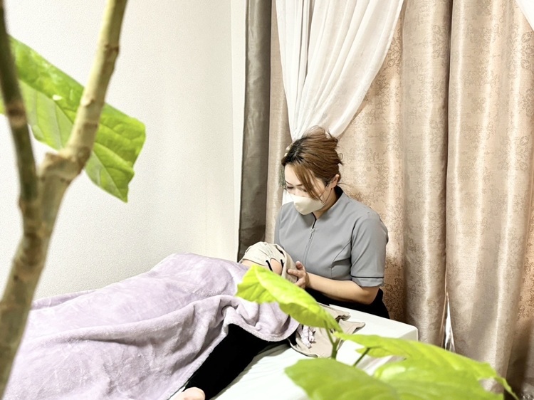 その後、温熱効果のあるアロマオイルや専用クリームなどを使い、内臓を温めるように丁寧にマッサージ。気になる箇所を入念に施術することで日頃から冷えてしまう指先、足先の血流を良くして温めていきます。